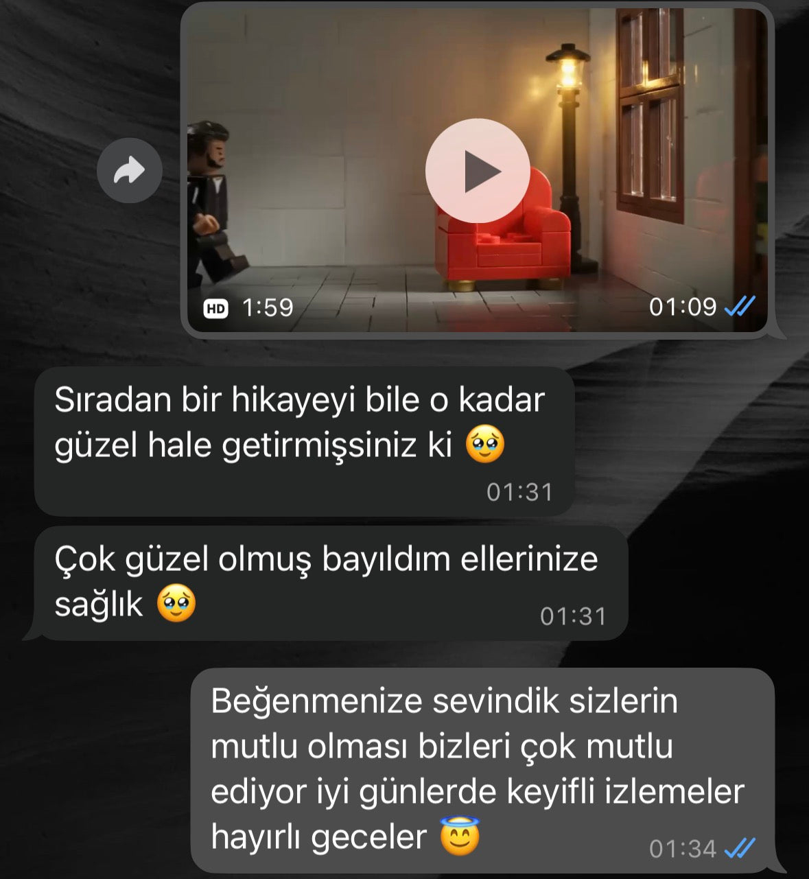 Videoyu ilk açtığımızda sadece eğlenceli olur diye düşünmüştük ama beklediğimizden çok daha anlamlıydı. Anlattığımız hikâyeyi LEGO dünyasında görmek inanılmaz bir his. Aynı gün teslim edilmesi de bizi ayrıca mutlu etti.