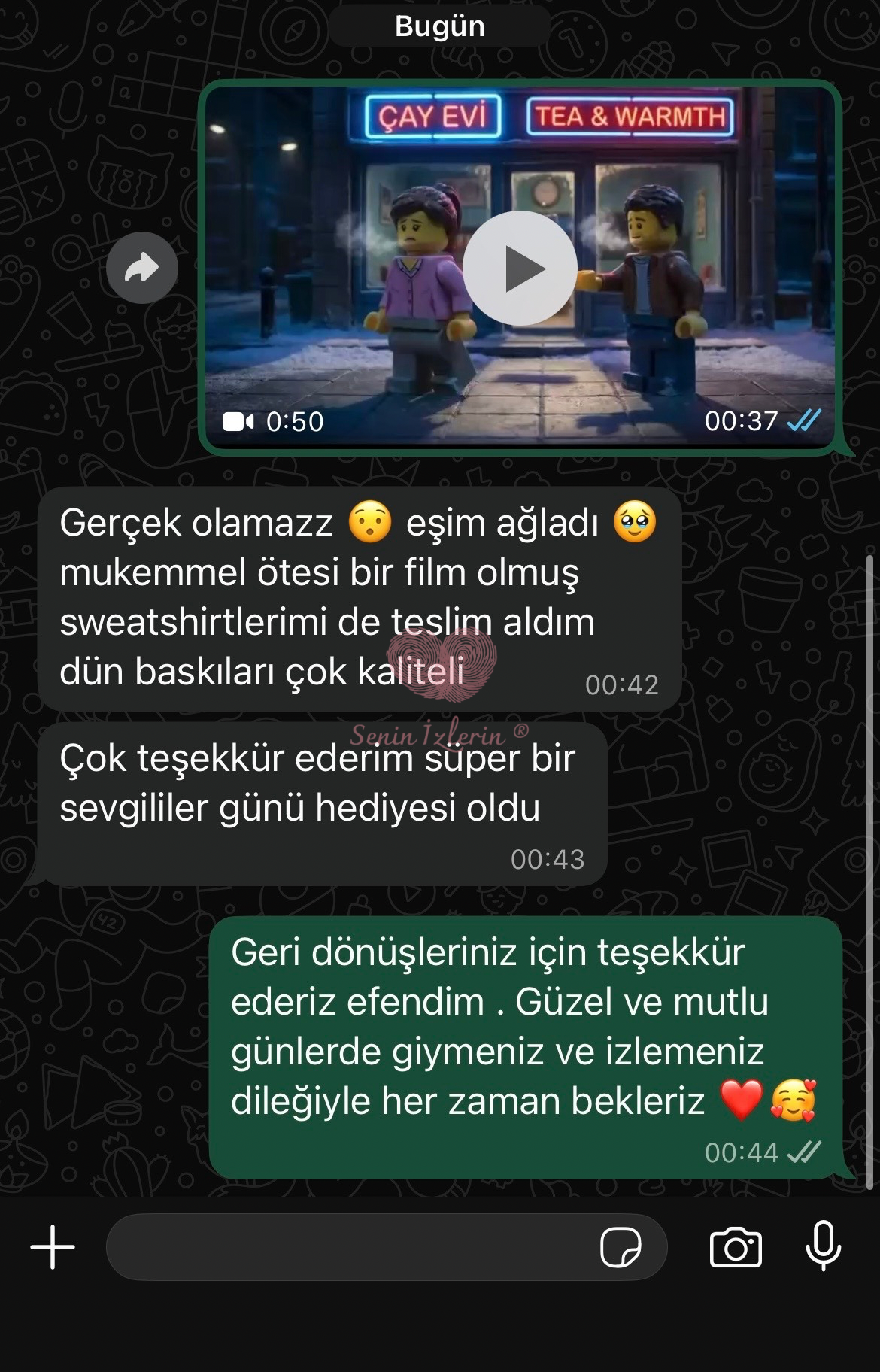 Yazdığım satırların bana bu kadar yaratıcı bu kadar etkili döneceğini hikayemizi bu kadar duygulu aktarıcaklarını düşünmemiştim. Sipariş vermeden önde düşündüm gerek var mı diye ama gerek varmış saçma sapan şeylere para harcamaktabsa böyle kalıcı duygulu şeyleri hatıra bırakmak daha önemli. Ne desem bilemiyorum çok teşekkür ederim iyi ki bu yolculuğu sizinle yapmışım. Hayatımıza anlam katan muhteşem bir animasyon çıkardınız tam da istediğim gibi daha öveceğim ama çok uzattım. Teşekkür ederim 🙏