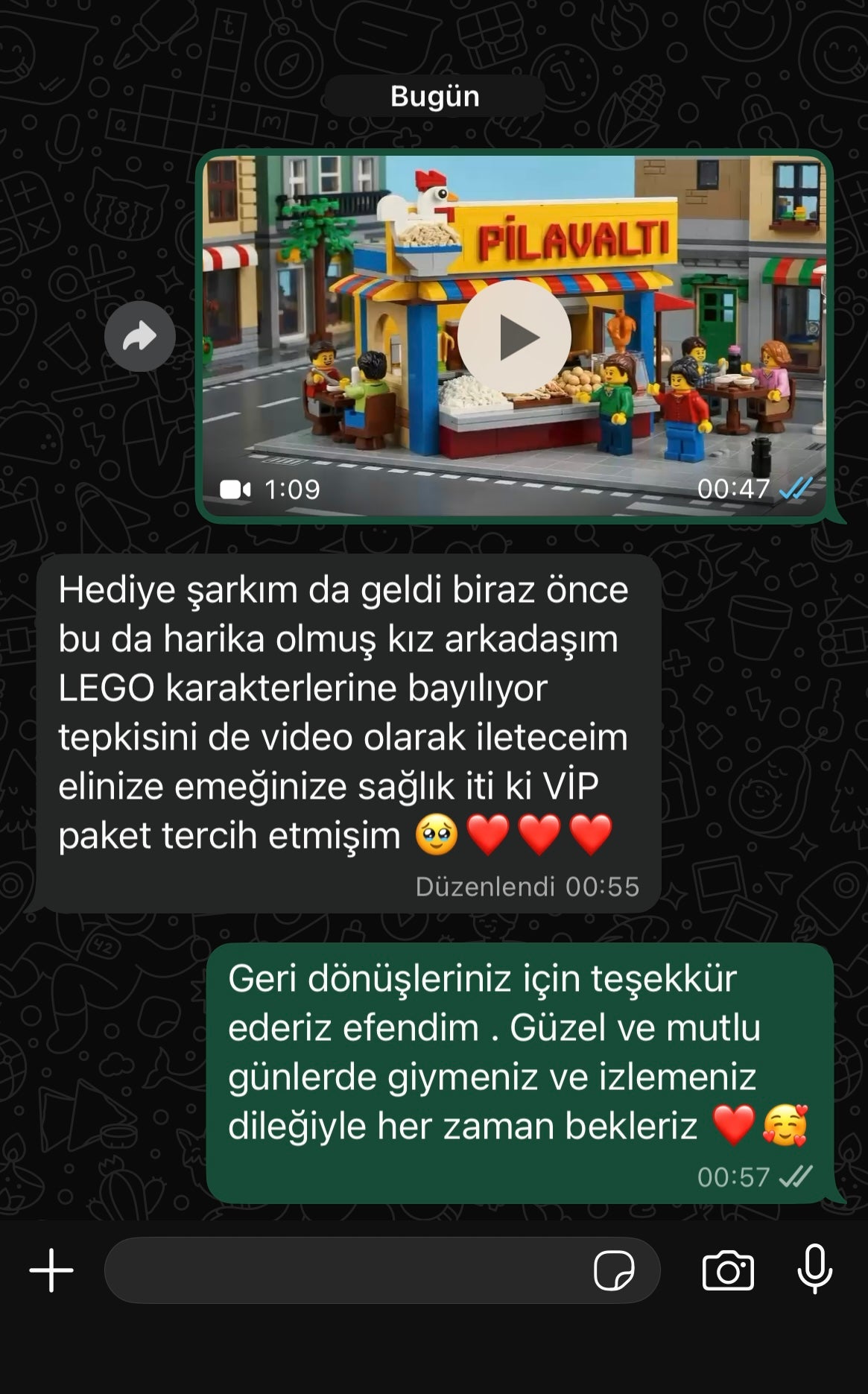 Sipariş verirken nasıl bir şey çıkacağını merak ediyordum ama izlediğimizde gerçekten şaşırdık. Küçük detayları bile eklemişler. LEGO karakterlerimizin bize benzemesi ayrı bir hoşumuza gitti. İzlerken hem güldük hem duygulandık.